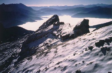 (8) Im Aufstieg zum Birnhorngipfel: ein Blick zurück aus der Birnhornsüdwand auf den Felskamm des Melkerloches und des Hochzints. Im Hintergrund beherrscht der Hochkönigsstock den Talkessel von Saalfelden. Der "Hofersteig" ( I-, 400 m, 2 Std.) quert am Melkerloch aus dem Hochgrubkar in den oberen Teil der Südwand hinein und führt in leichter und abwechslungsreicher Kletterei über Bänder und Rinnen in vielen Serpentinen bis zum Gipfelgrat hinauf. Der Steig ist gut markiert, jedoch nicht gesichert und an einigen Stellen sehr ausgesetzt. (Foto: 05.10.97) |