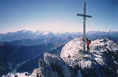 (9) Auf dem Birnhorngipfel (2634 m): hinter den Schieferbergen der östlichen Kitzbüheler Alpen erheben sich die Firngipfel der Hohen Tauern. Im rechten Teil des Bildes ist die Großglocknergruppe mit dem höchsten Berg Österreichs, dem Großglockner (3797 m), im linken Teil die Venedigergruppe mit dem Großvenediger (3674 m) gut zu erkennen. Der meist begangene Weg auf das Birnhorn führt über die Westflanke zum Gipfel hinauf. Ausgehend vom Kuchelnieder quert man in die Westwand hinein und erreicht über ein breites mit Geröll bedecktes, steil nach oben führendes Band in leichter Kletterei den Gipfel. (Foto: 05.10.97) |