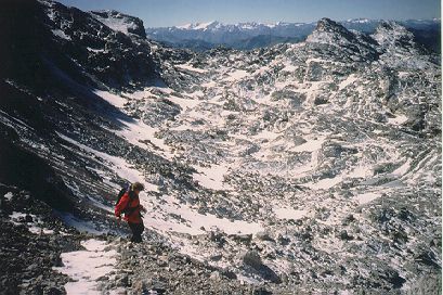 (10) Eine besondere Eigenart der Leoganger Steinberge ist die Bildung ausgedehnter Karmulden nördlich des Hauptkammes. Vom Hauptkamm zweigen mehrere Nebenkämme nach Norden ab und unterteilen die Nordhänge in mehrere Karmulden. Im Westen sind diese die Große und Kleine Saugrube, das Ebersbergkar in der Mitte, und das Hochgrub- und Dürrkar im Osten. Das Bild zeigt den oberen Teil des Ebersbergkars vom Kuchelnieder gesehen. Über der Rietzenkarscharte erhebt sich in der Ferne der Tauernkamm mit dem Großvenediger. (Foto: 05.10.97) |